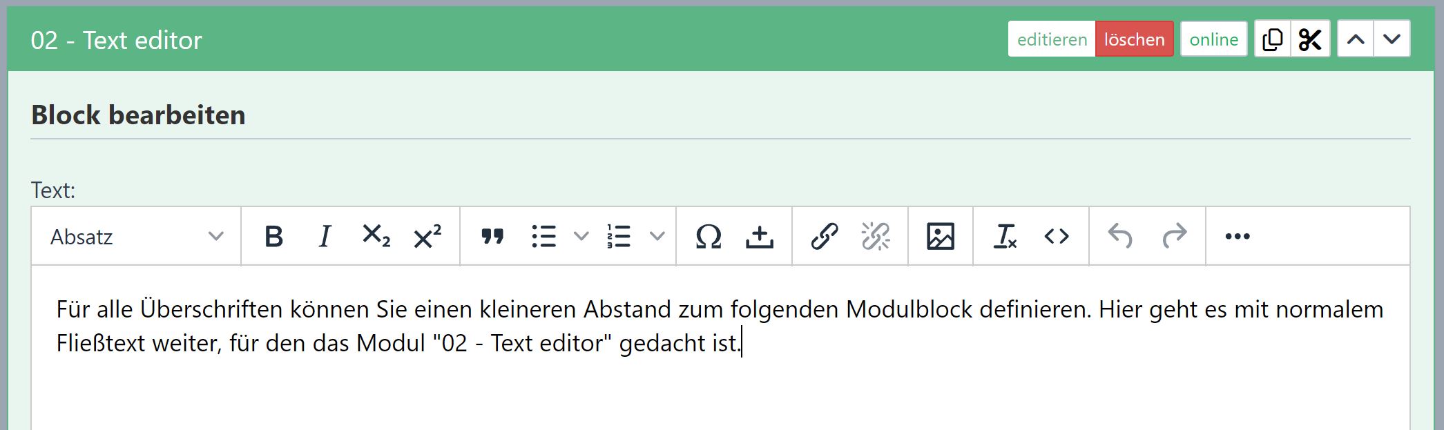 Für alle Überschriften können Sie einen kleineren Abstand zum folgenden Modulblock definieren. Hier geht es mit normalem Fließtext weiter, für den das Modul "02 - Text editor" gedacht ist.
