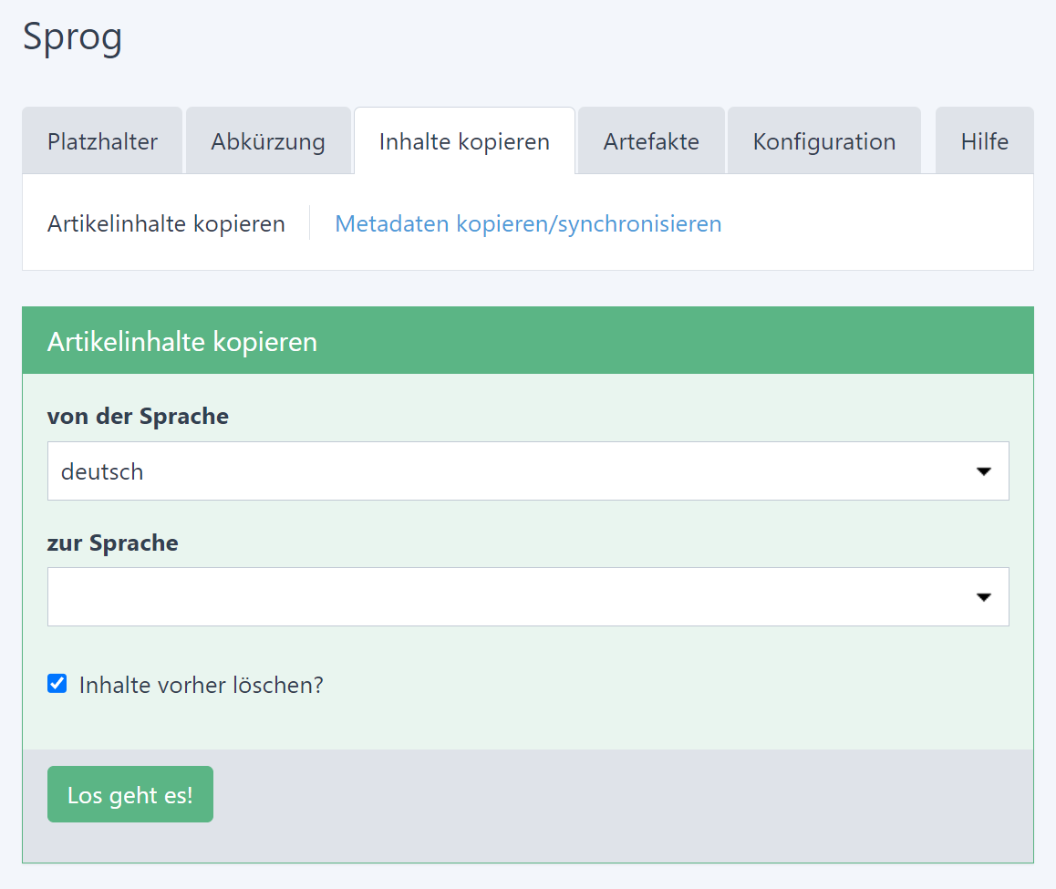 Im AddOn Sprog kopieren Sie die Inhalte aller Artikel der Ausgangssprache in die neue Sprachversion.